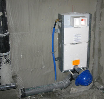מיכל הדחה סמוי לאסלה תלוייה. סביב המיכל נבנה בלוקים או בלוחות גבס ועליהם יותקן החפוי.